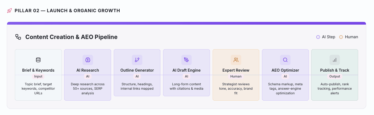 Expert humans set direction and quality standards. AI handles the heavy middle—the repetitive, scalable, high-volume work. Humans review and refine the output.